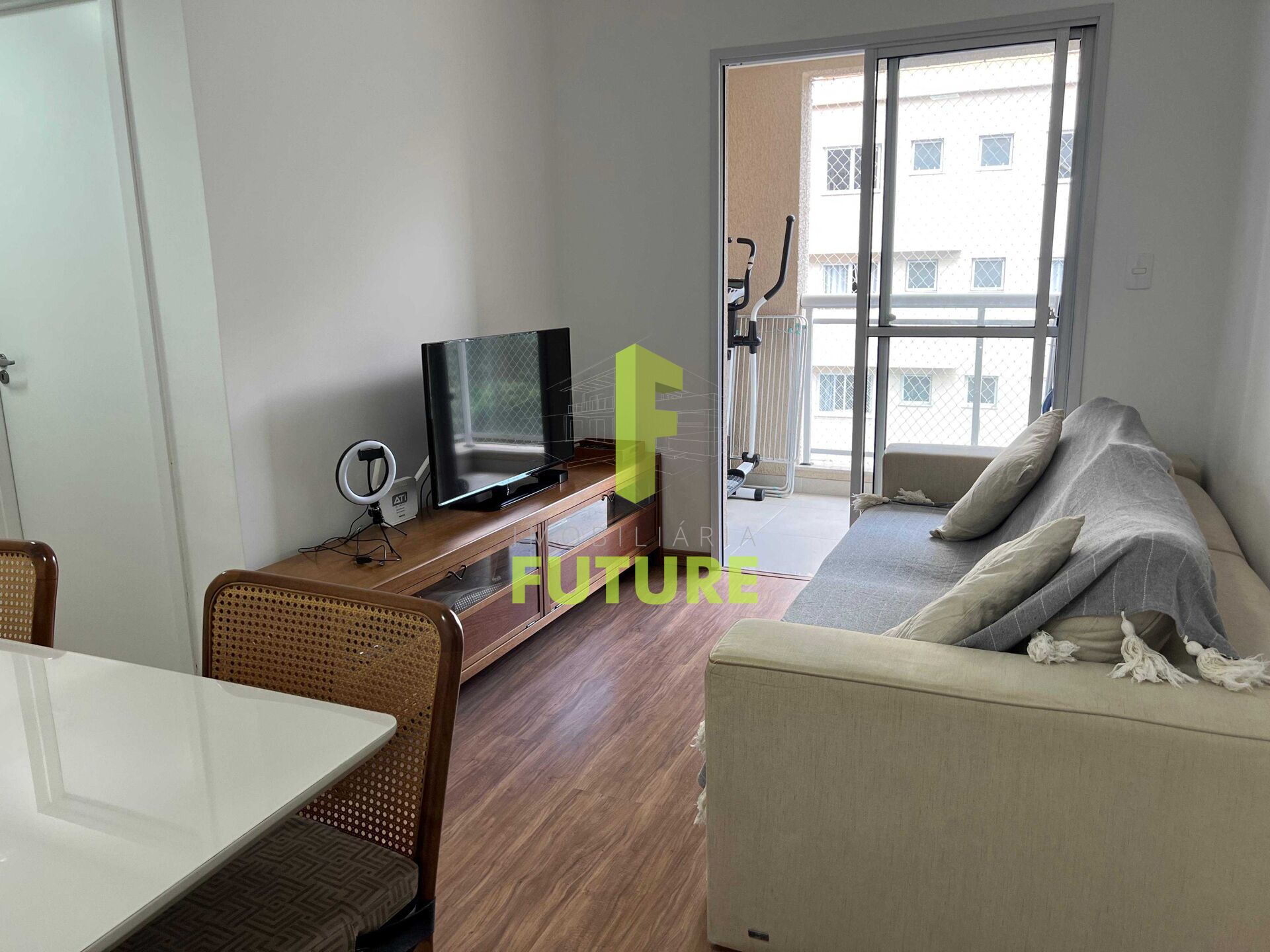 Uma sala dois ambientes e varanda com área gourmet