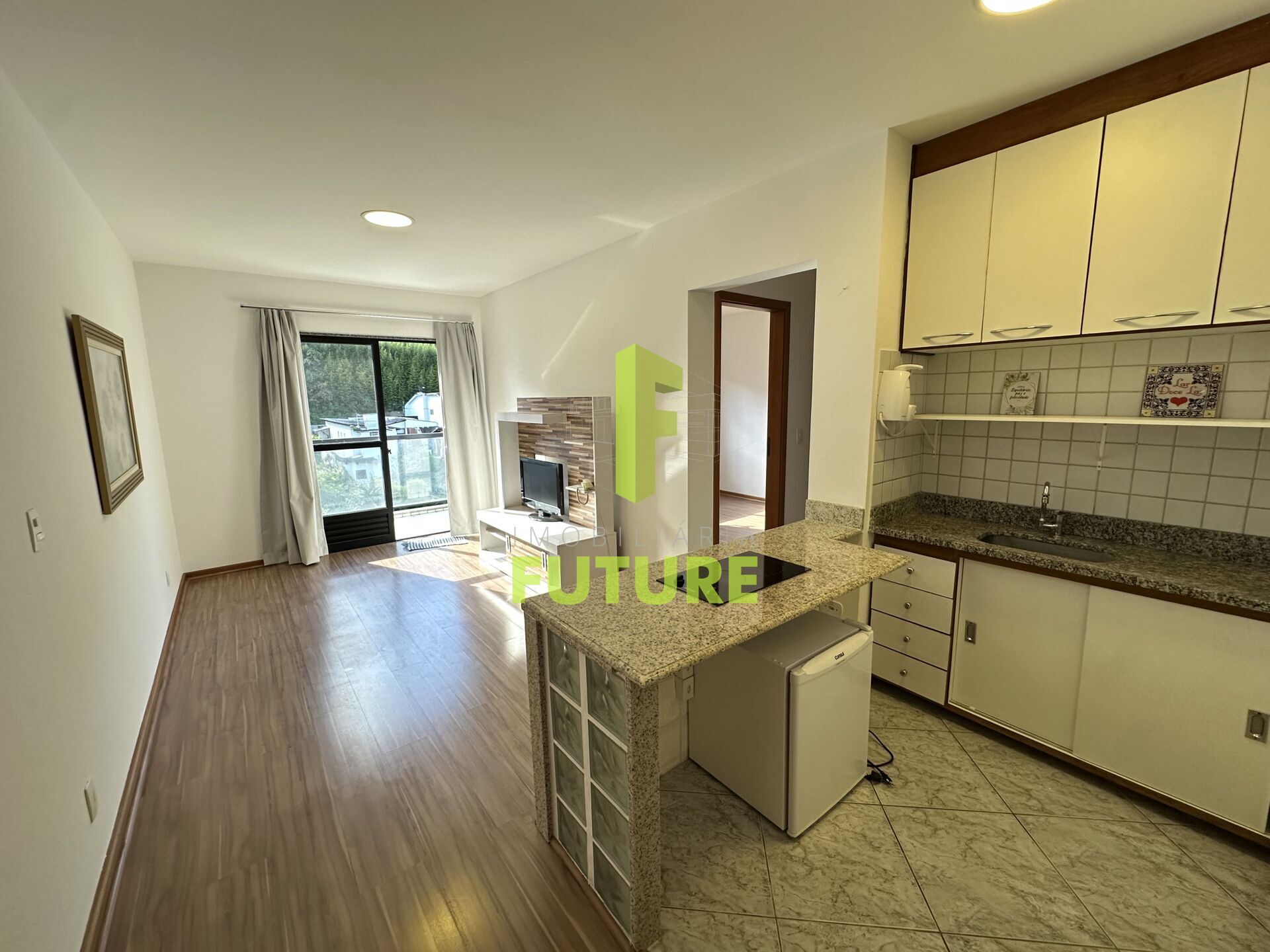 O apartamento é composto por uma sala com varandas é cozinha integrada ja com os planejados, um banheiro social e um quarto.
